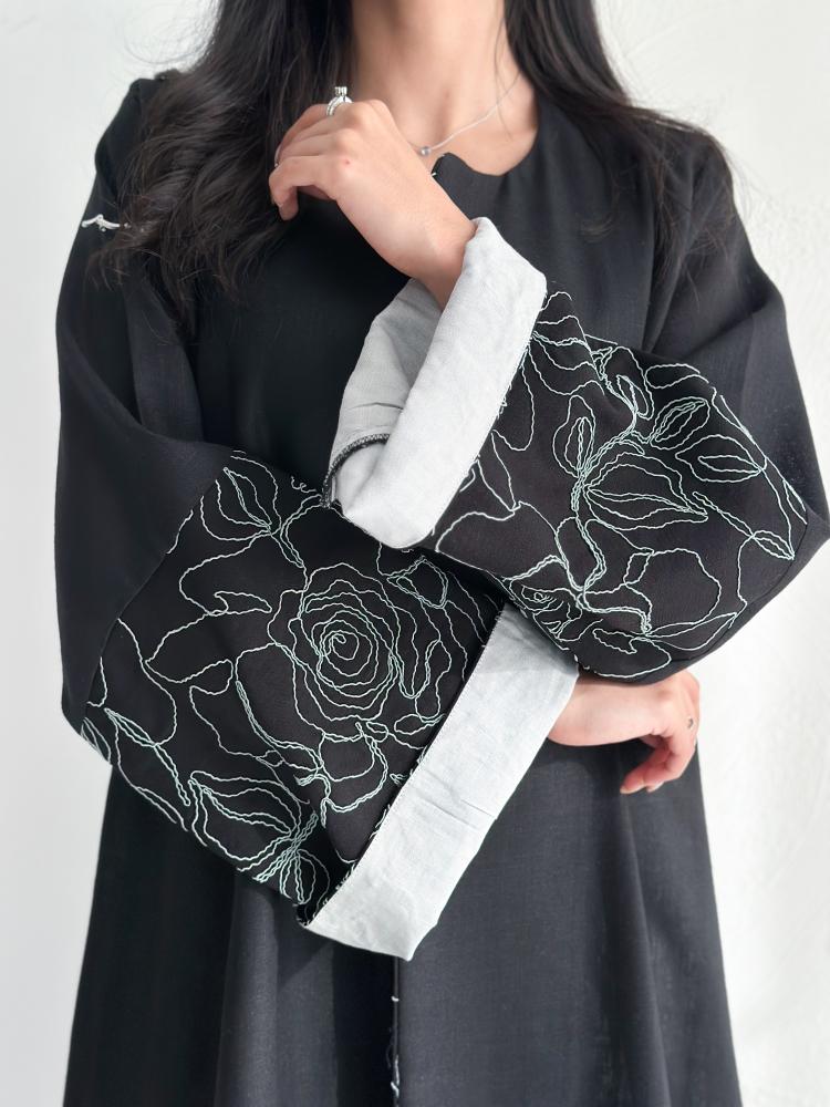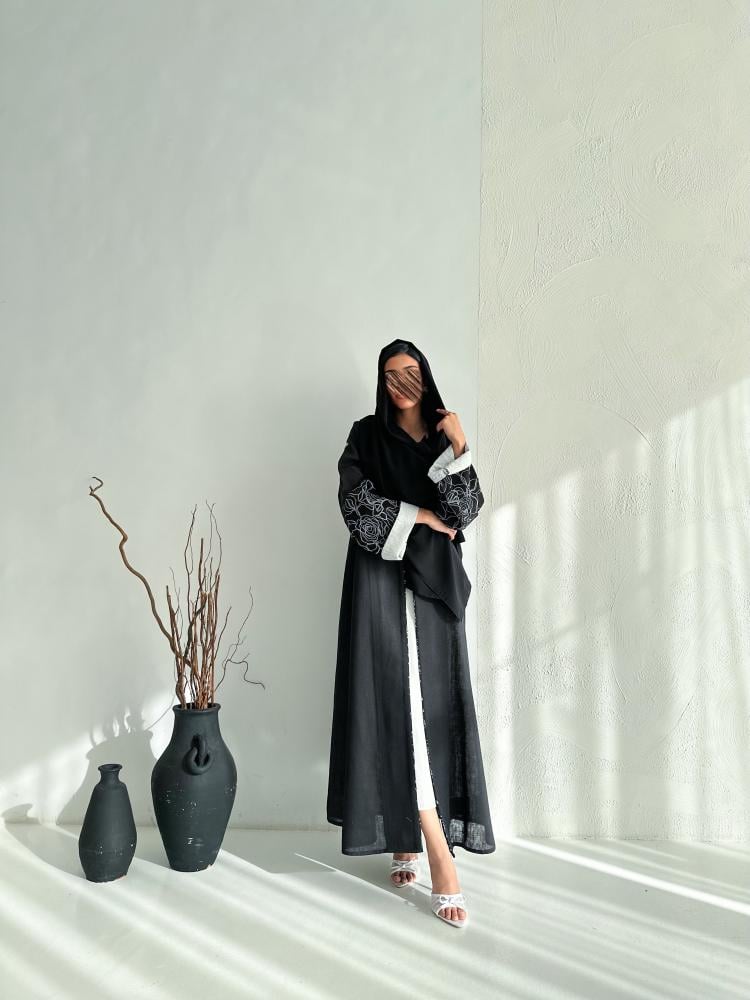 تأتي عباية لينن هندي بقصة A Line انسيابية تمنحك الراحة مع لمسة أنوثة واضحة. الأكمام مزينة بتطريز أنيق متعدد الألوان يضفي حيوية راقية على التصميم، بينما الطرحة المصنوعة من نفس القماش والمزودة بكلفة ناعمة تجعل الإطلالة متكاملة وأنيقة في كل مناسبة.
